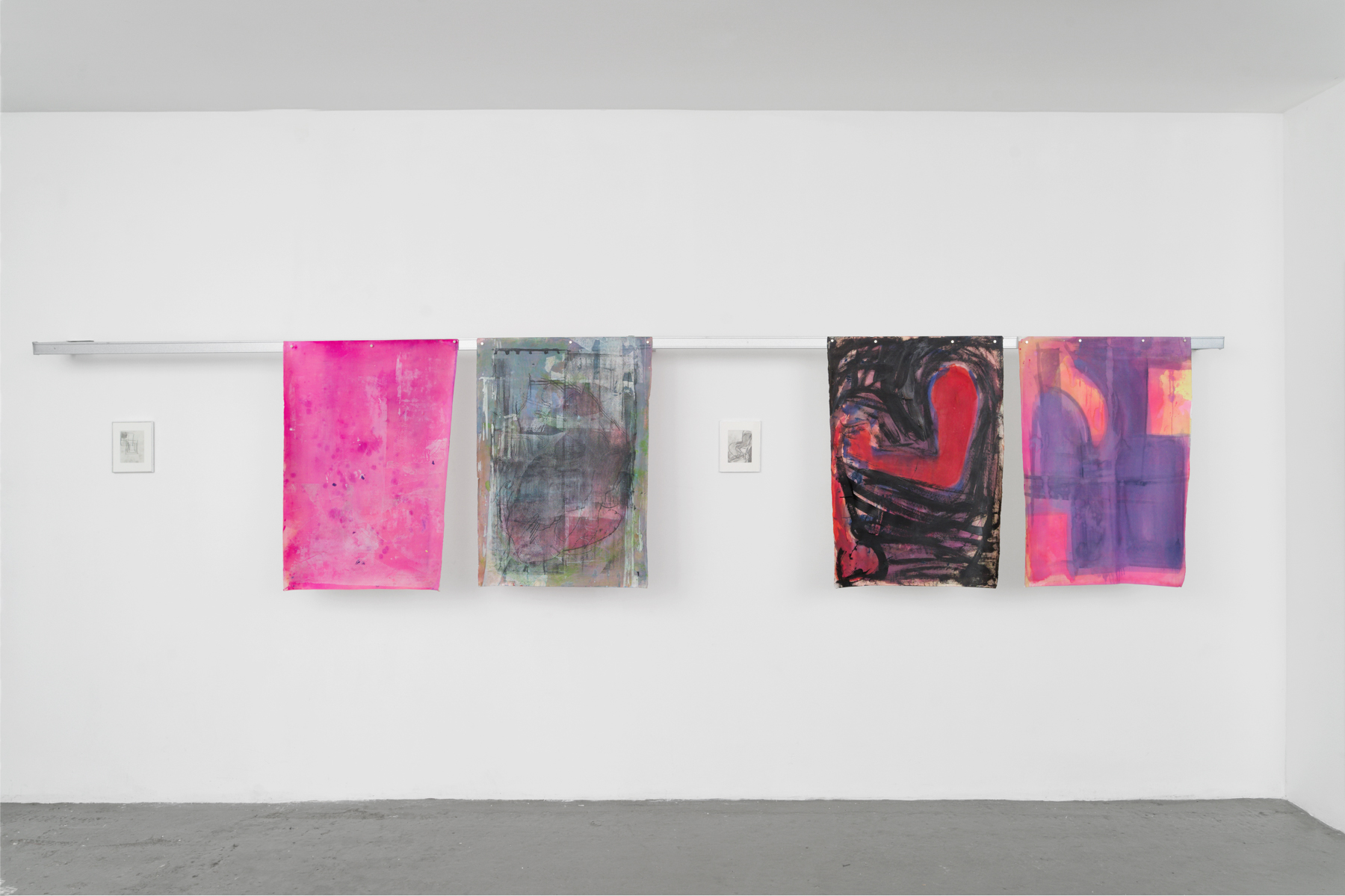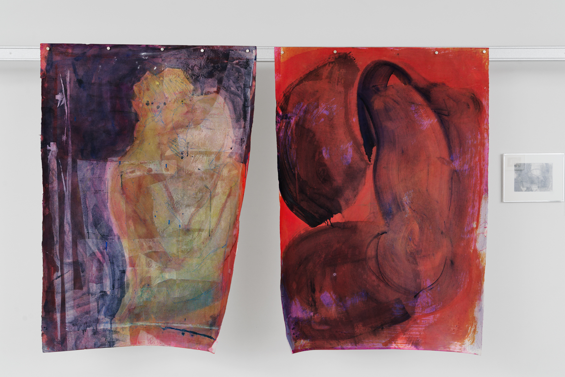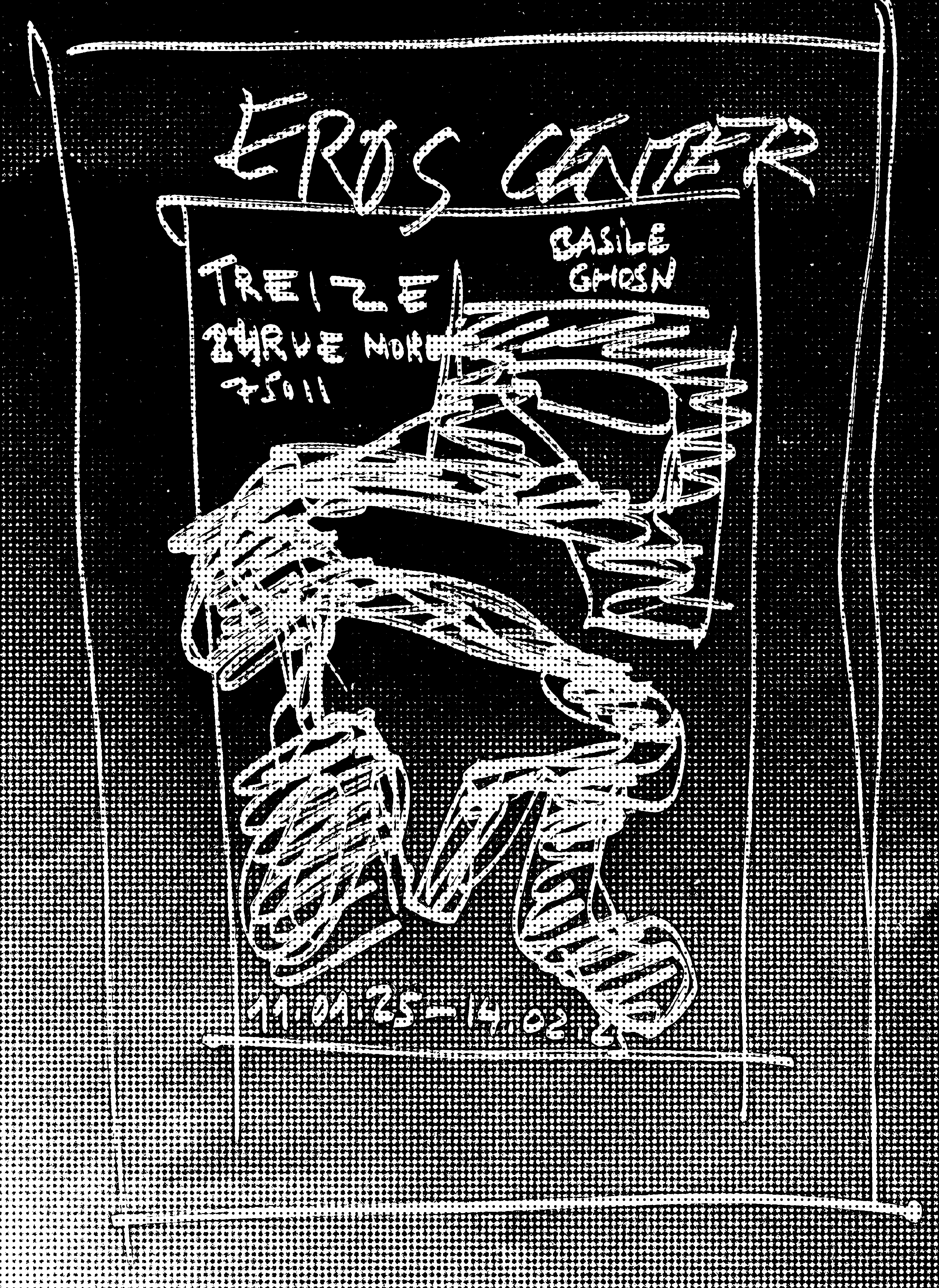 La série EROS CENTER composée de grandes peintures sur papier et de petits dessins constitue un départ et un déport par rapport à sa pratique. Les imprimés architectoniques, monde nécessairement dépeuplé, s’effacent. Quand il affleure, le rêve moderniste présente son revers de cauchemar. Et si l’on croit distinguer des tours de béton et d’acier, on ne sait plus si elles sont là inachevées ou déjà détruites par la catastrophe. Eros Center. C’était le nom d’un sex-shop marseillais. Il est fermé. Une opération immobilière est en cours. La forme d’une ville change plus vite, on le sait bien, que le corps des mortels. Nous sommes quelques-uns à y être passés, dans celui-là ou dans d’autres, cherchant de quoi mater, sinon toucher ; miracle de ces étreintes-là. On ne peut pas dire qu’il n’en restera rien, puisque des corps s’en souviennent. Pour raconter cette mémoire labile des mouvements et du sexe, il a donc fallu des gestes, une peinture toute en gestes, dont le trouble et la liquidité frôlent l’informel – ou flirtent, c’est selon, avec ce que l’artiste Amy Sillman nomme avec affection un détournement camp de l’expressionisme abstrait. D’où, ici et là, c’est bien Basile, quelques clins d’œil rieurs, des éclats de joie, et forcément, une ou deux private jokes. La rareté tant désirée du calme, aussi. En s’approchant des peintures, le chaos des gestes en raconte un autre, enchevêtrement confus de bras, de jambes, mains et sexes enlacés, membres qui s’étreignent, pour la tendresse ou la détresse – vous aussi ? Welcome to the Pleasure Dome – wait, or is that the Iron Dome ?