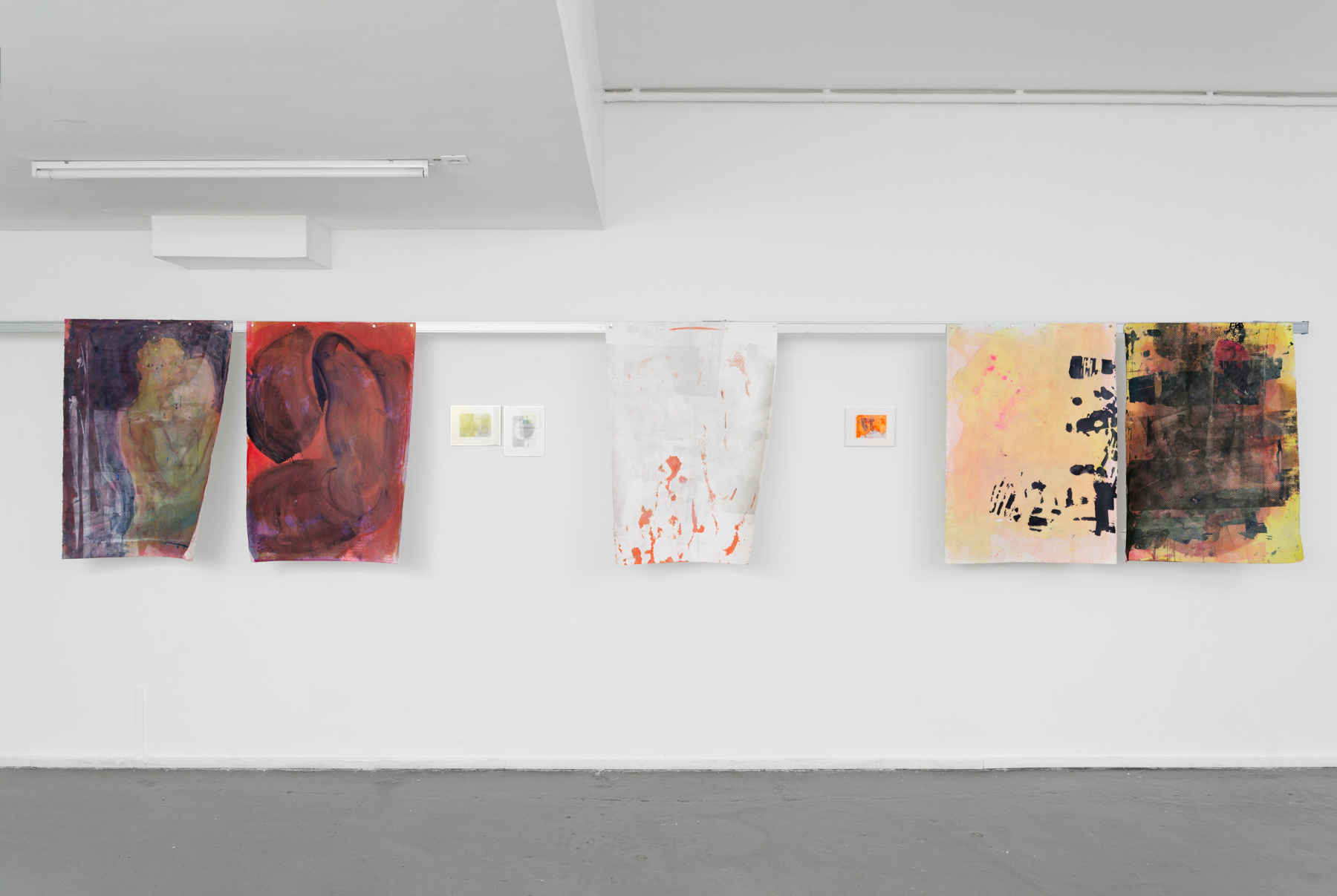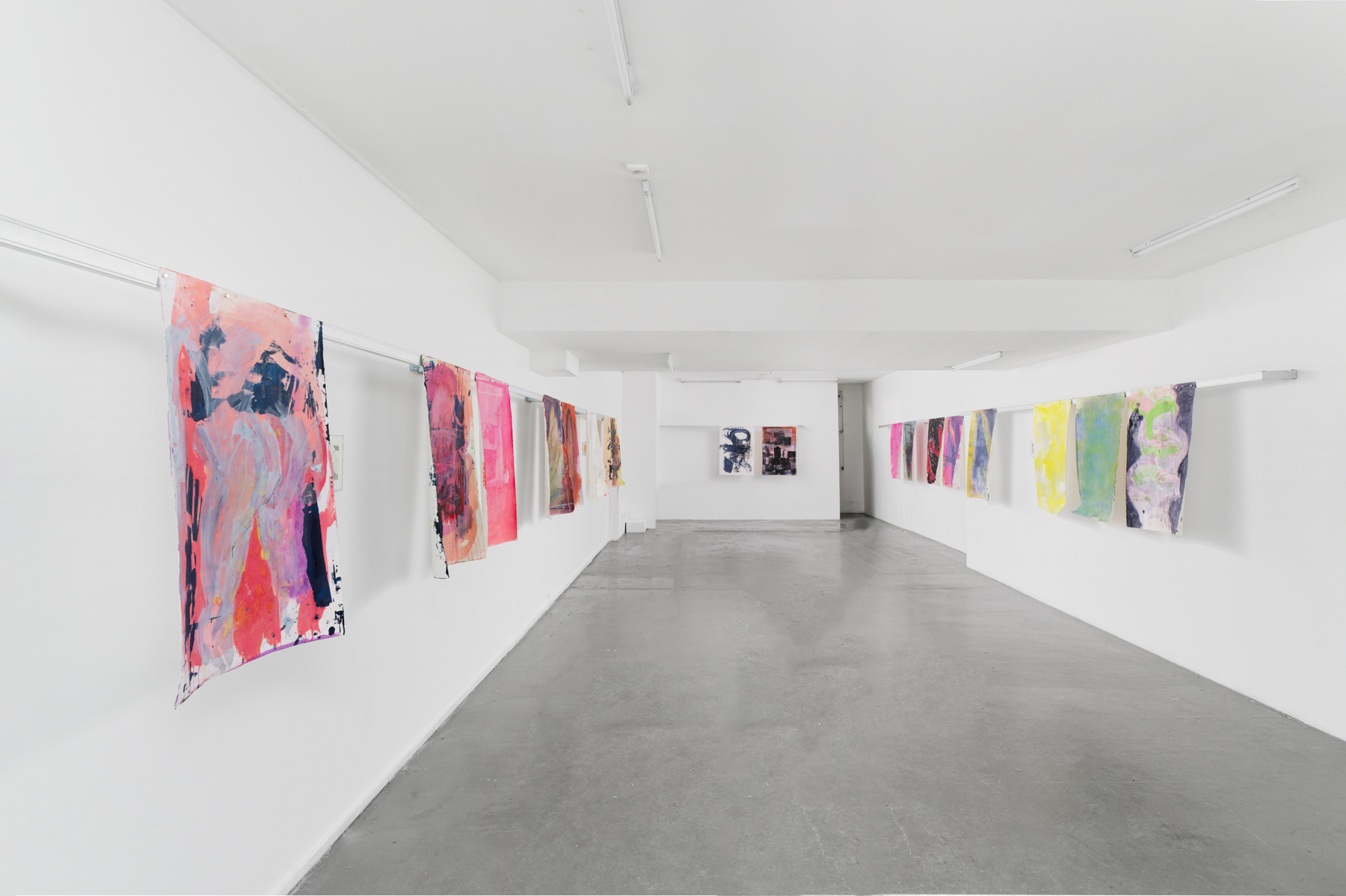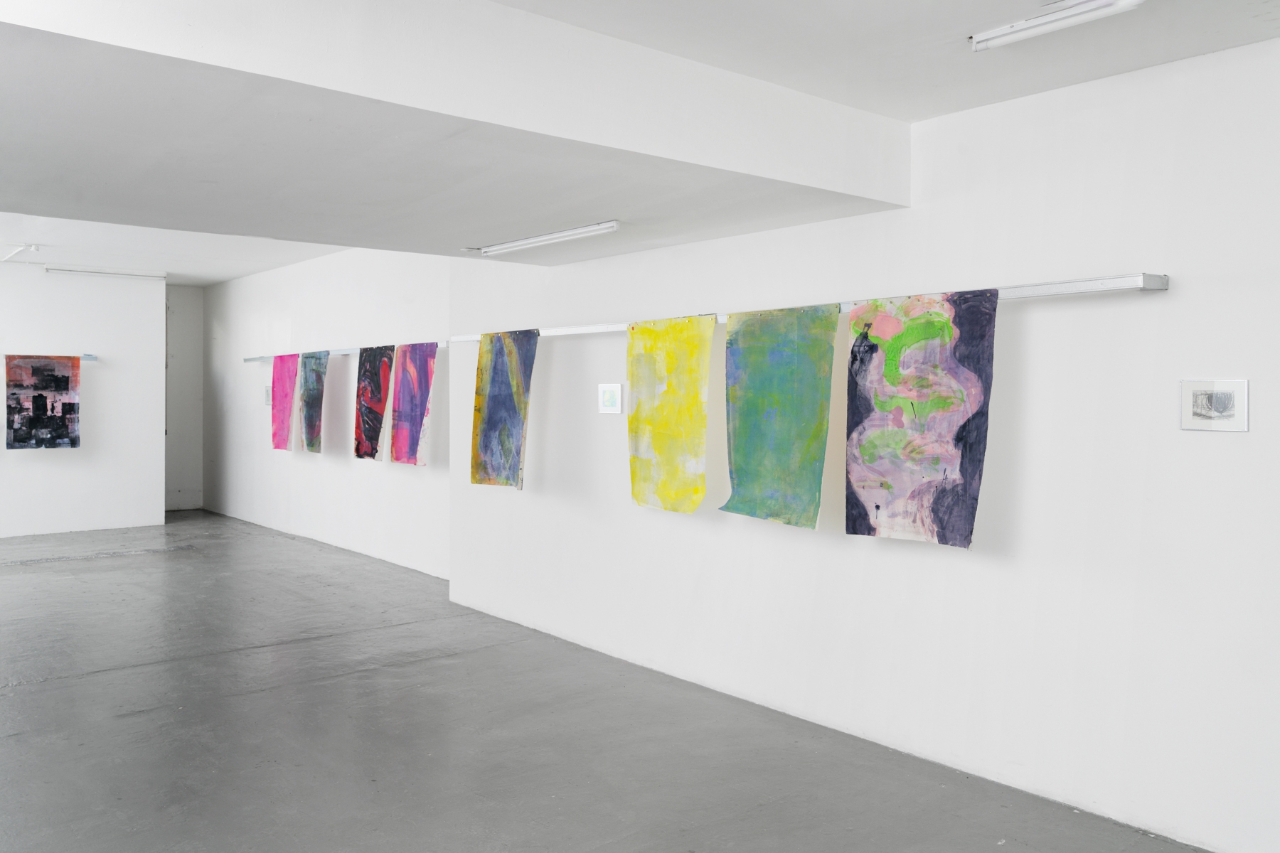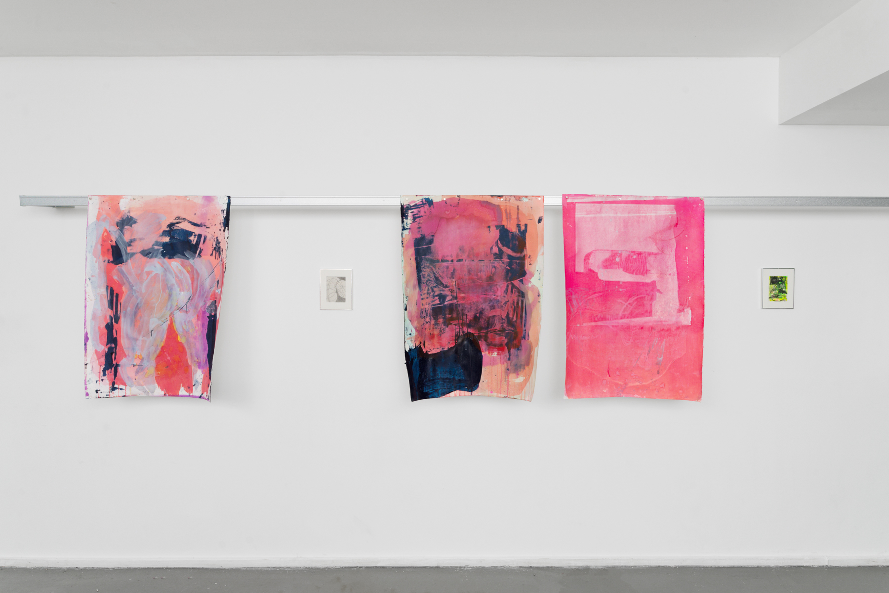 La série EROS CENTER composée de grandes peintures sur papier et de petits dessins constitue un départ et un déport par rapport à sa pratique. Les imprimés architectoniques, monde nécessairement dépeuplé, s’effacent. Quand il affleure, le rêve moderniste présente son revers de cauchemar. Et si l’on croit distinguer des tours de béton et d’acier, on ne sait plus si elles sont là inachevées ou déjà détruites par la catastrophe. Eros Center. C’était le nom d’un sex-shop marseillais. Il est fermé. Une opération immobilière est en cours. La forme d’une ville change plus vite, on le sait bien, que le corps des mortels. Nous sommes quelques-uns à y être passés, dans celui-là ou dans d’autres, cherchant de quoi mater, sinon toucher ; miracle de ces étreintes-là. On ne peut pas dire qu’il n’en restera rien, puisque des corps s’en souviennent. Pour raconter cette mémoire labile des mouvements et du sexe, il a donc fallu des gestes, une peinture toute en gestes, dont le trouble et la liquidité frôlent l’informel – ou flirtent, c’est selon, avec ce que l’artiste Amy Sillman nomme avec affection un détournement camp de l’expressionisme abstrait. D’où, ici et là, c’est bien Basile, quelques clins d’œil rieurs, des éclats de joie, et forcément, une ou deux private jokes. La rareté tant désirée du calme, aussi. En s’approchant des peintures, le chaos des gestes en raconte un autre, enchevêtrement confus de bras, de jambes, mains et sexes enlacés, membres qui s’étreignent, pour la tendresse ou la détresse – vous aussi ? Welcome to the Pleasure Dome – wait, or is that the Iron Dome ?