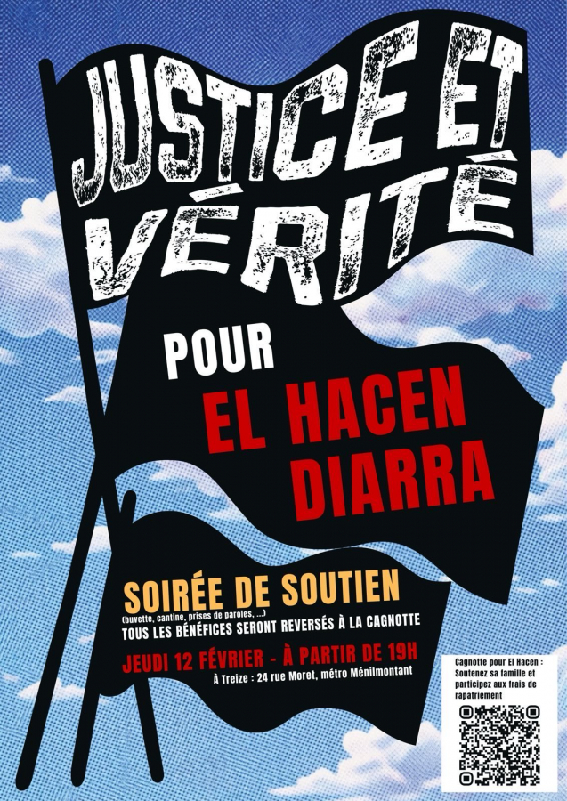 Ces événements ont lieu autour de nous et menacent nos quartiers, nos espaces de rencontre, de sociabilité, et nos allié-es ! C’est la raison pour laquelle il est pour nous important d’organiser cette soirée de soutien en collaboration avec la coopérative de Ménilmontant, la Marche des Solidarité, le comité Justice pour El Hacen Diarra et les habitant-es du foyer des Mûriers. L’argent récolté au cours de la soirée sera reversé à la cagnotte pour participer aux frais de justice de la famille et au rapatriement du corps d’El Hacen Diarra.
